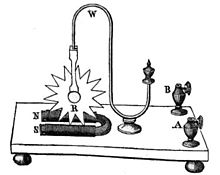 An electric current passes through the hub of the wheel which rim is dipped into a small mercury trough. The interaction of the current with the magnetic field of a U-magnet causes the wheel to rotate. The serrated wheel replaces the free wire (the tips) in Faraday's experiment. Though the original wheel, introduced by Barlow, was serrated the wheel will also work with a smooth round metal disk as well, usually made of a conductive material like copper. You can try to compare the efficiency of the two designs. Barlow's wheel demonstration:https://nationalmaglab.org... http://www.youtube.com... http://physics.kenyon.edu... The Invention of the Electric GeneratorWhereas the homopolar motor converts electrical energy into mechanical energy, the homopolar generator does the reverse: converts mechanical energy into electricity by reversed action. If in the above mentioned Faraday's electric motor experiments an electric current that passed through the free wire caused it to rotate around the permanent magnet then a moving wire through a magnetic field (perpendicular to it) will produce a voltage on the wire and if the circuit is closed also a current. In short, in the presence of an electromagnetic field a current can move a wire and a wire movement can generate a current.