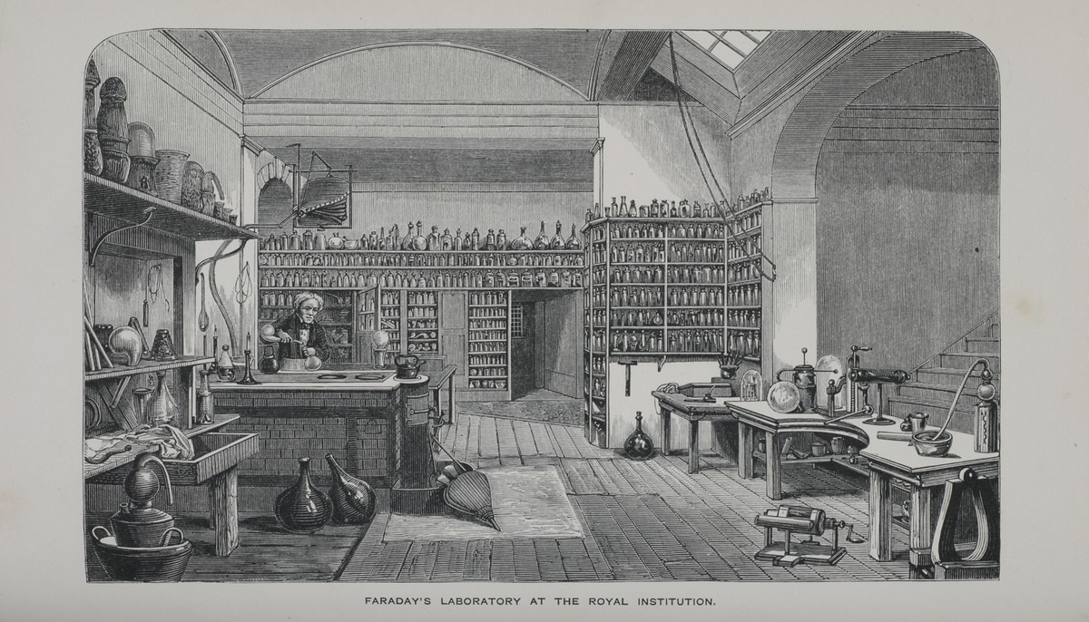 Faraday's Laboratory at the Royal Institution (1870 engraving)